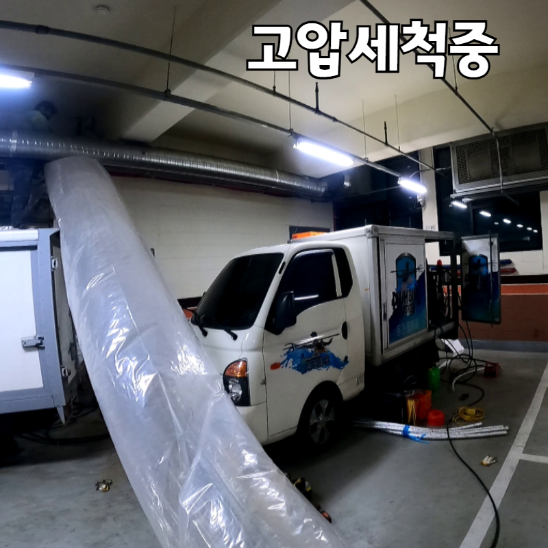 바로 고압세척을 준비하여 상가 공용배관을 뚫어주는 작업을 시작 했습니다.
