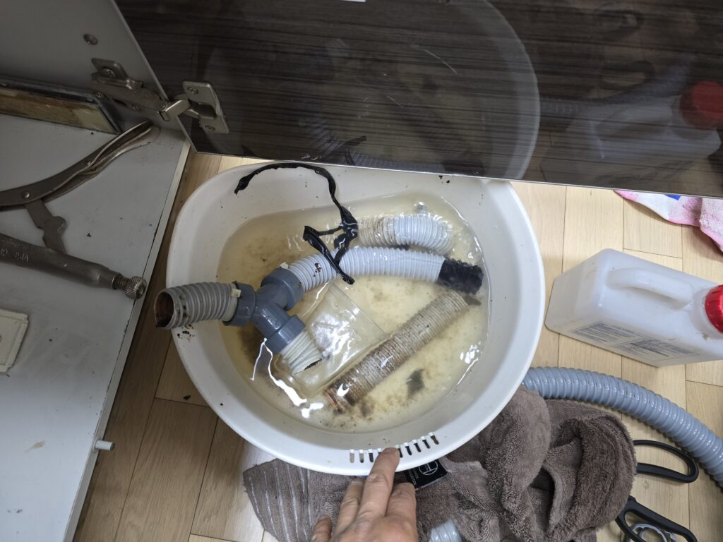 그동안 한 번도 싱크대 하수구 청소를 하지 않아 배관 내부에는 기름때로 가득했습니다