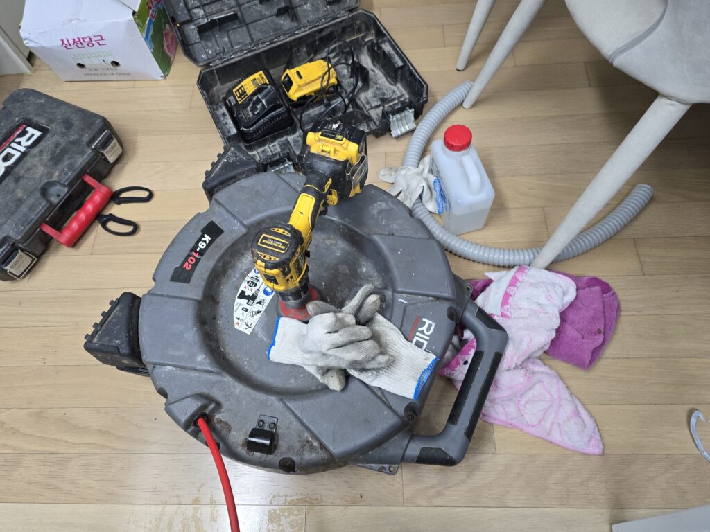 플렉스 샤프트로 번져 싱크대 하수구를 뚫어 내고 스케일링 작업을 이어 갔습니다