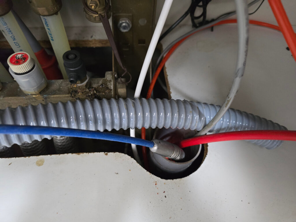 그렇게 한참을 작업 하여 막힌 싱크대를 뚫어 낸 뒤 물을 흘려 가려면 기름때 및 찌꺼기들을 배출 시켜 놨습니다 그런 뒤 내시경 카메라를 배관 안으로 진입 시켰습니다