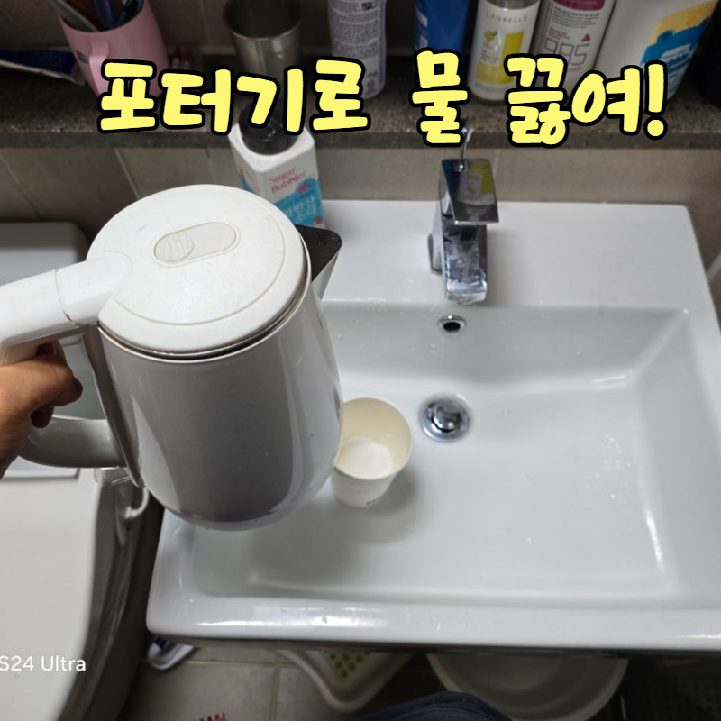 먼저 종이컵에 일정량을 부어 줍니다. 종이컵 1/3정도의 양을 부어주면 됩니다. 그리고 나서 포터기로 물을 팔팔 끓여주어야 합니다. 따듯한 물이 아니면 과탄산소다가 일부는 녹고 일부는 녹지 않아 세척력을 기대 할 수가 없습니다.