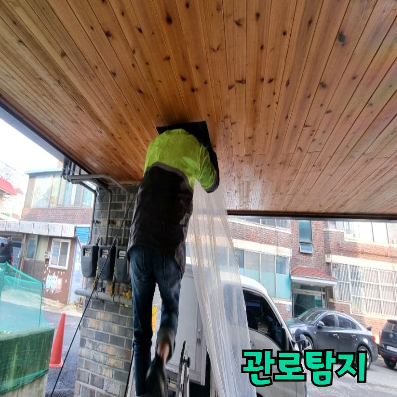 관로탐지 장비로 배관을 찾아낸뒤 배관이 있는곳으로 천장을 절개 했습니다.