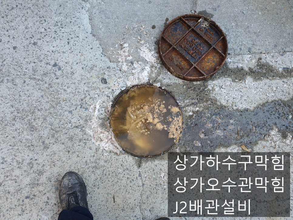 건물밖의 소형맨홀 오수받이에서 변기물이 맨홀로 나가지 못하고 넘치고 있던 상황이었습니다.