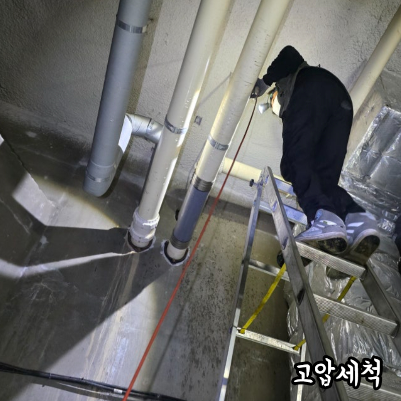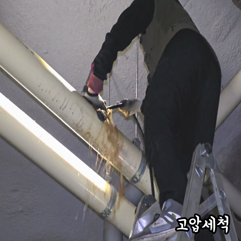 고압세척기를 준비하여 공용배관막힘의 위치를 찾아 내부에서 배관에 구멍을 내어 뚫어내기 시작했습니다.