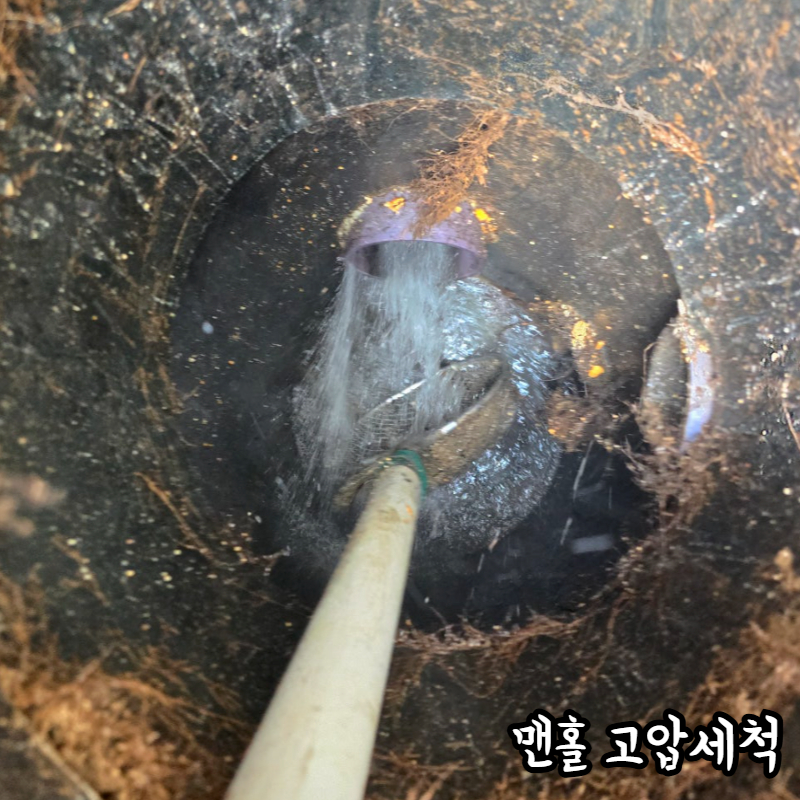 공용배관내 쌓인 기름 덩어리를 모두 제거하기 위해 맨홀에서 다시 고압세척을 이어 갔습니다.