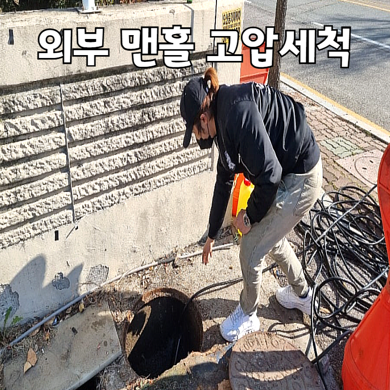 먼저 식당 밖의 맨홀에서 하수구 고압세척을 시작 했습니다.