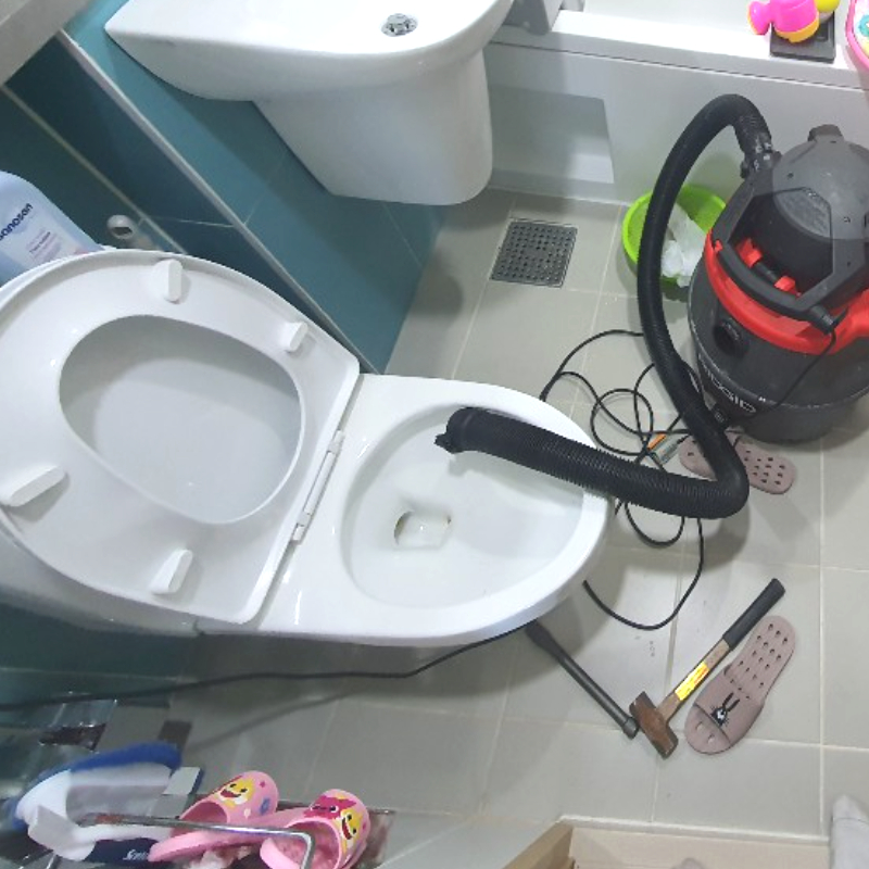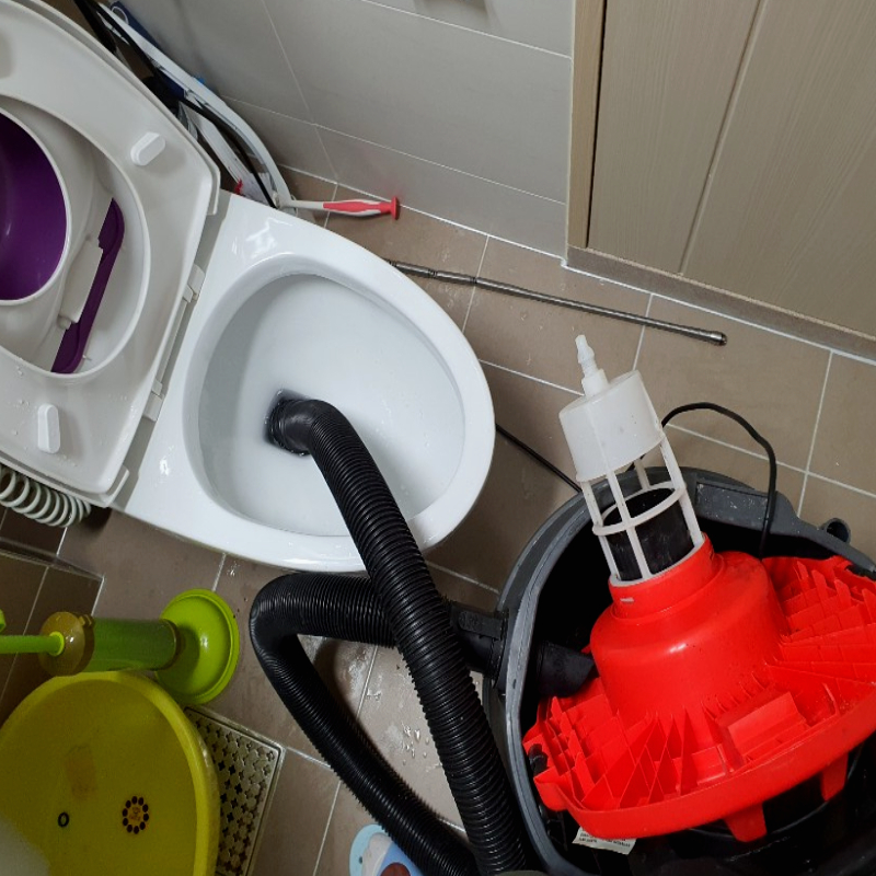 역시나 변기막힘 현장이 쉽게 끊나지 않았습니다. 변기를 탈거해야 하는가 고민이 들었지만 뜯지 않고 해결하는 것이 비용적으로나 작업 효율적으로나 더 좋기 때문에 관통기로 휴지걸이 각로를 바꿔가며 석션으로 빨아당겼습니다.