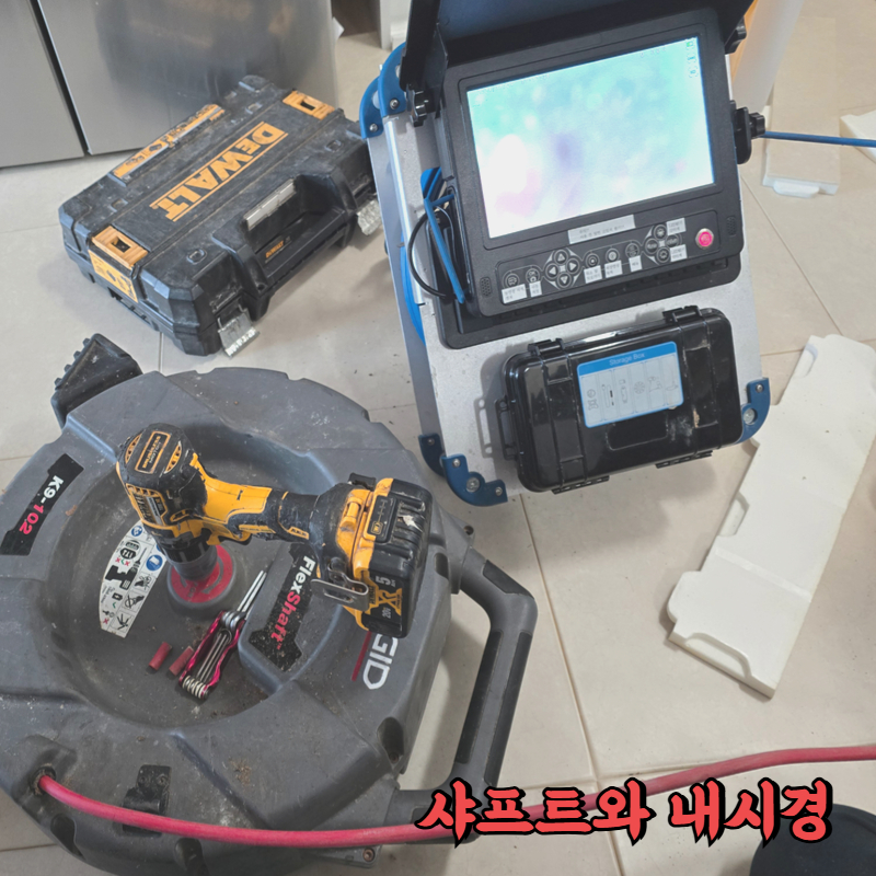 석션으로 싱크대 배관 내부를 흡입한뒤 플랙스샤프트 장비를 사용하여 내부 배관을 뚫고 나갔습니다.
