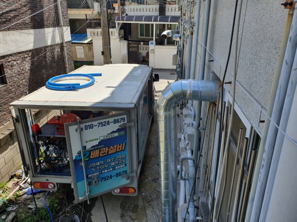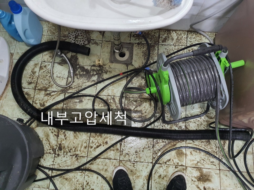 가장 진행한 작업은 공용 배관 고압세척입니다. 매인 배관에 쌓인 기름 덩어리와 찌꺼기를 모두 제거한 뒤, 큰 배관에서 부터 작은 배관으로 배관 막힘 원인을 좁혀갈 계획이었습니다.