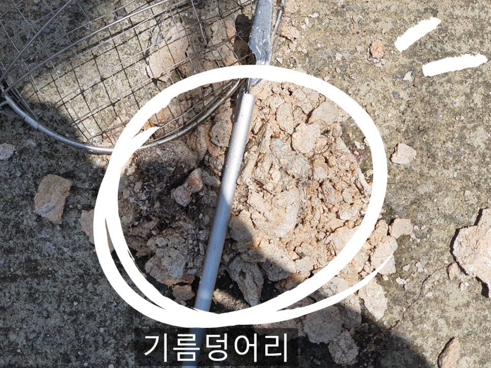 50A 배관을 타공을 하여 고압세척을 시작하자 두번째 오수받이로 기름 덩어리가 다량 배출되기 시작했습니다.