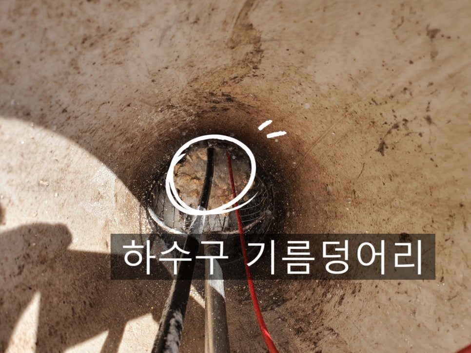 고압세척을 시작하자 오수받이에서는 오래된 기름 덩어리들이 터져 나오기 시작했습니다.