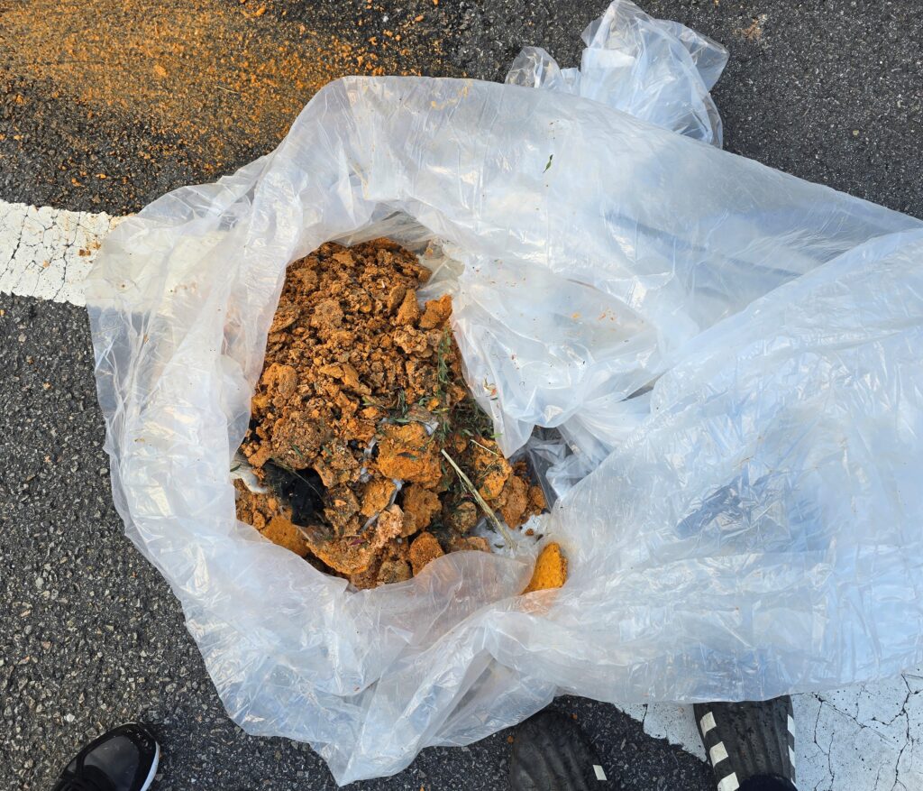 그렇게 하수구가 뚫리기 시작하니 반대편 맨홀에서는 기름이 쏟아져 나왔습니다. 상당히 많은 양의 지방 덩어리가 제거되어 나왔는데 하수구로 흘러들어가지 않게 수거했답니다.