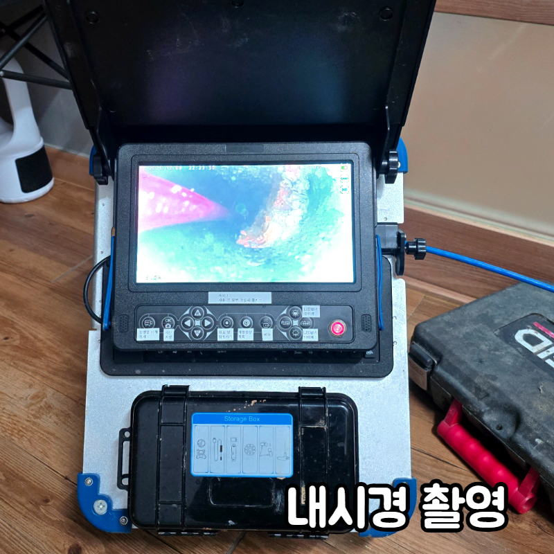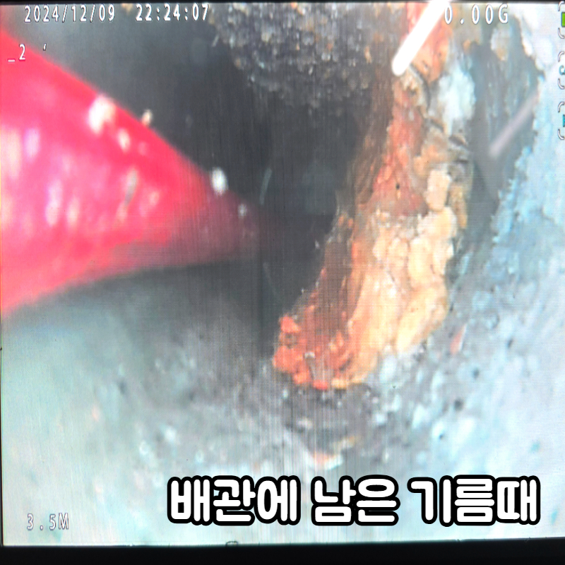 본격적으로 내시경 촬영에 들어갔답니다. 역시나 배관내 남은 기름덩어리가 내시경 화면에 보이기 시작했습니다.