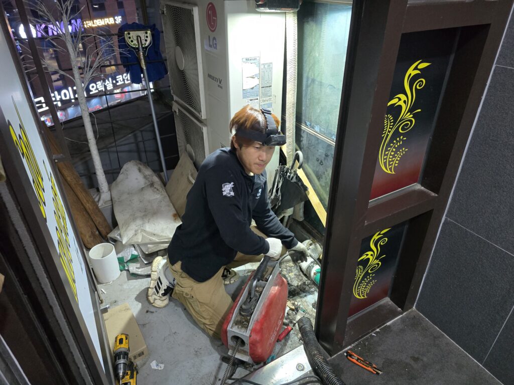 석션으로 물을 뺀 후 매인 배관이 있는 곳으로 다가가 하수 배관 통수 작업을 시작했습니다.