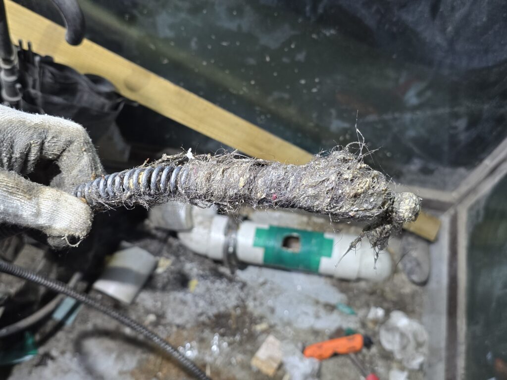 스프링으로 왕복 운동을 하여 그 구간의 기름때 및 이물질을 제거하는 작업을 하였고 1차로 스프링을 회수했습니다. 스프링 끝에 사람의 털이 많이 걸려 나왔습니다.